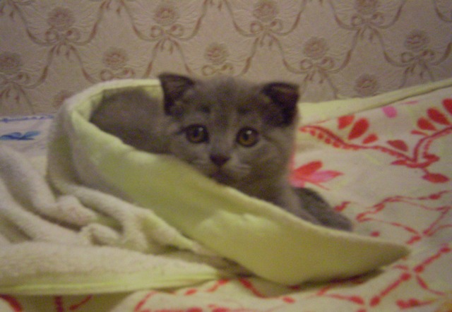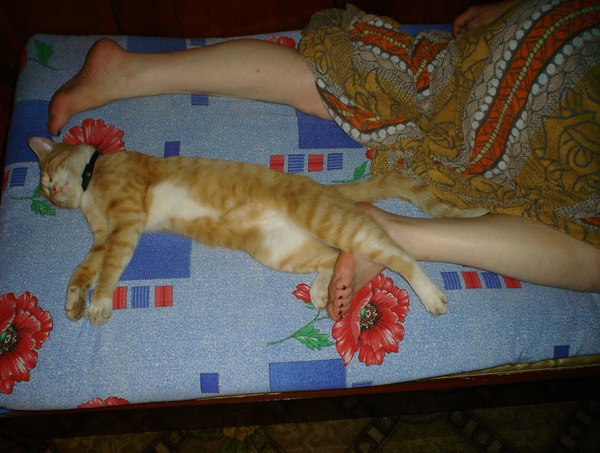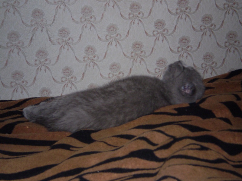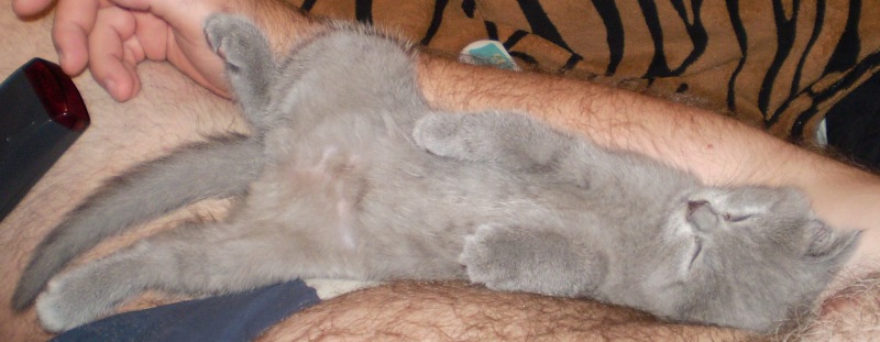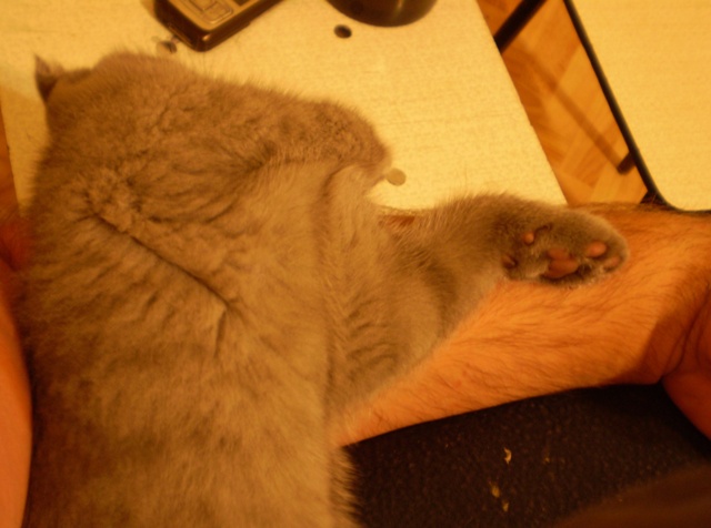 Вчера моя левая рука была кроваткой (а может типа веткой дерева): серое пушистое чудо положило свои передние лапки мне на ладошку, подперев сверху мордочкой, а левая задняя лапа свисала с руки... Сегодня поза несколько поменялась.