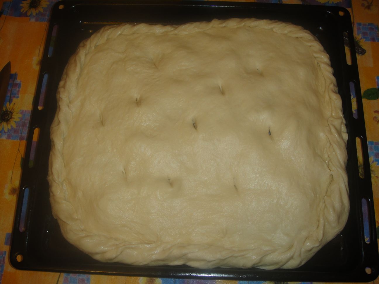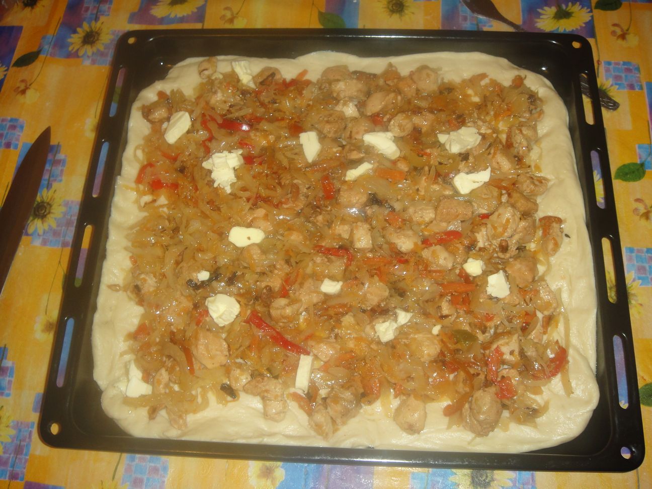 тесто достаем, отрезаем 2/3 и раскатываем по противню (предварительно смазав маслом), оставляя бортики. сверху раскладываем начинку ровненько и строгаем немного слив. масла кусочками